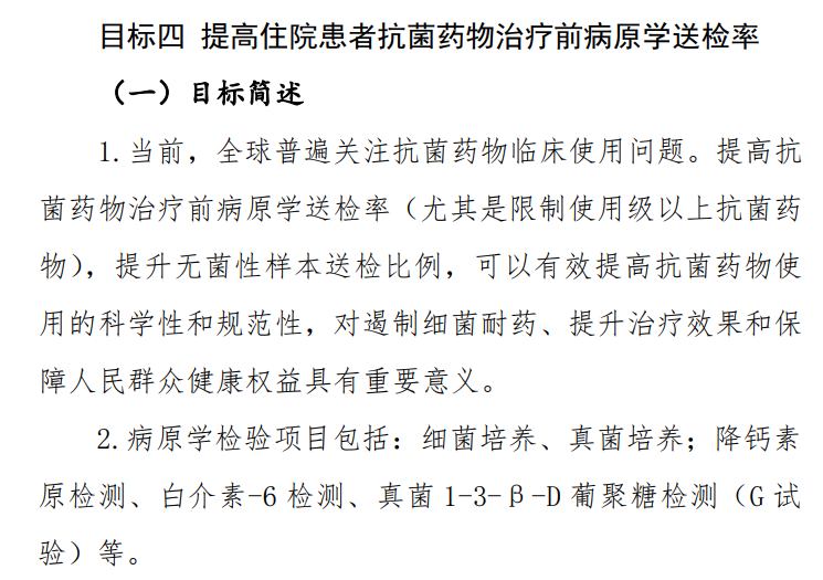 國家衛生健康委辦公廳關於印發《2021年國家醫療質量安全改進目標的通知》中目標四提出 “ 提高住院患者抗菌藥物治療前病原學 ”