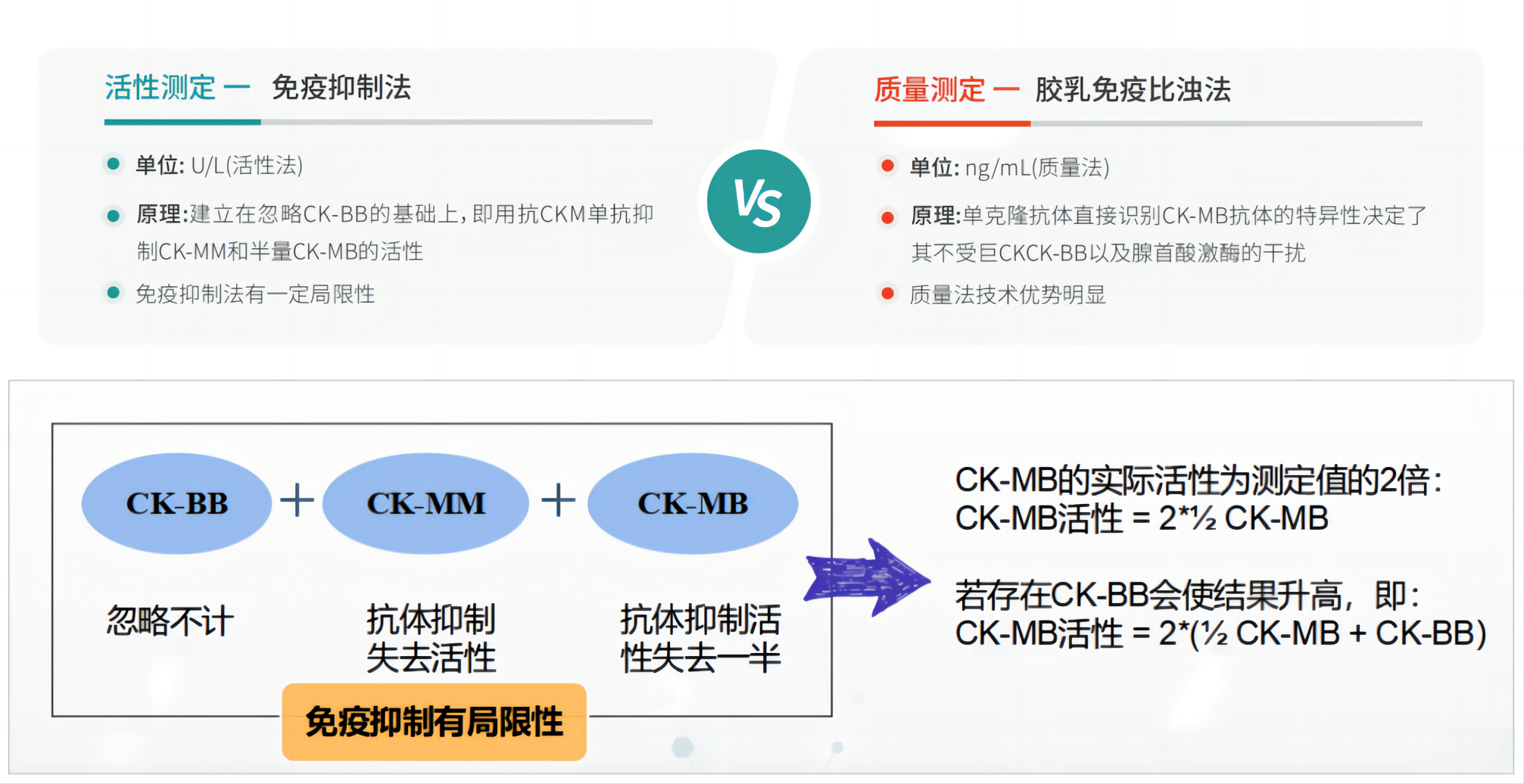 肌酸激酶(CK)檢測有2種方法(活性法和質量法)。目前全國約有一半的實驗室使用活性法(免疫抑製法)來檢測CKMB,但活性法常受多種幹擾因素的影響,導致部分結果不準確。而質量法相比活性法優勢明顯,不僅敏感度高、特異性高,且不受CKBB、巨CK以及腺甘酸激酶的幹擾。