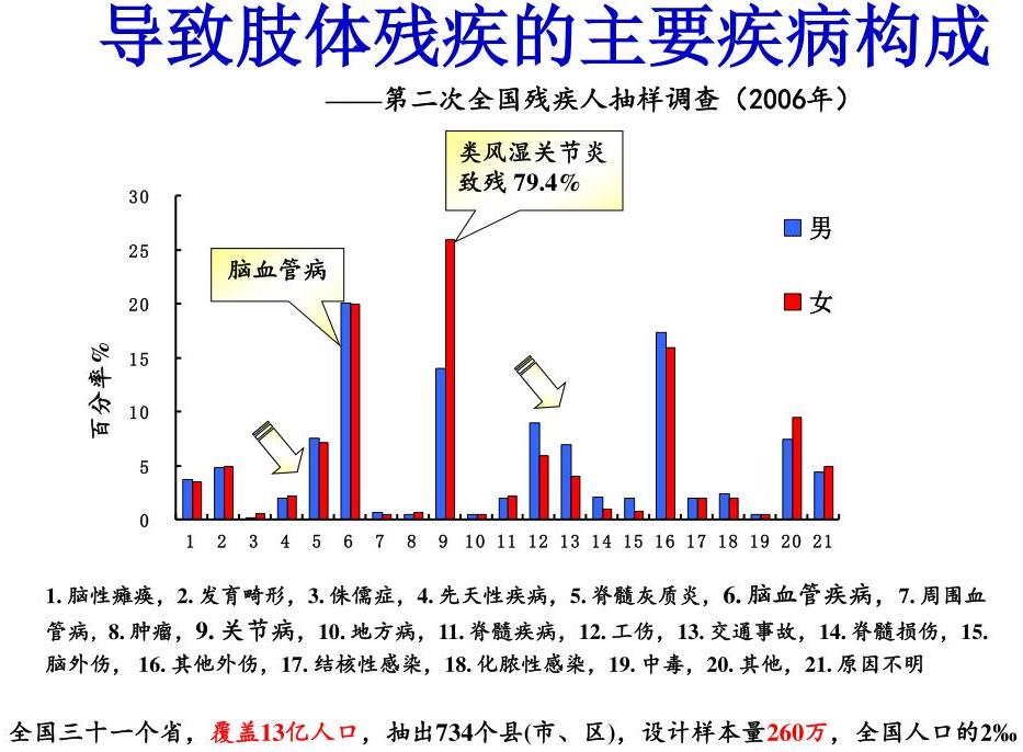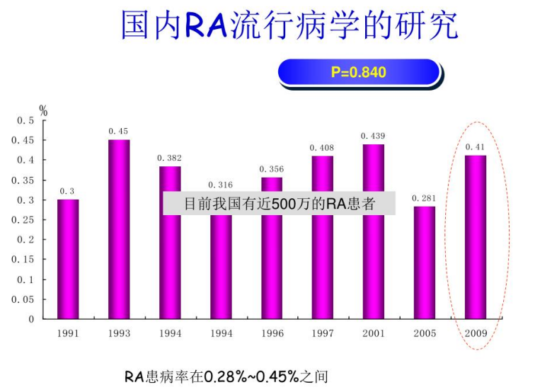 美日患病率分別為3.0%和0.3%,我國RA患病率在0.28~0.45之間,目前我國有近500萬的RA患者,類風濕關節炎致殘率79.4%。