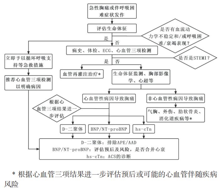 急性胸痛伴呼吸困難患者心血管三聯標誌物聯合應用流程圖