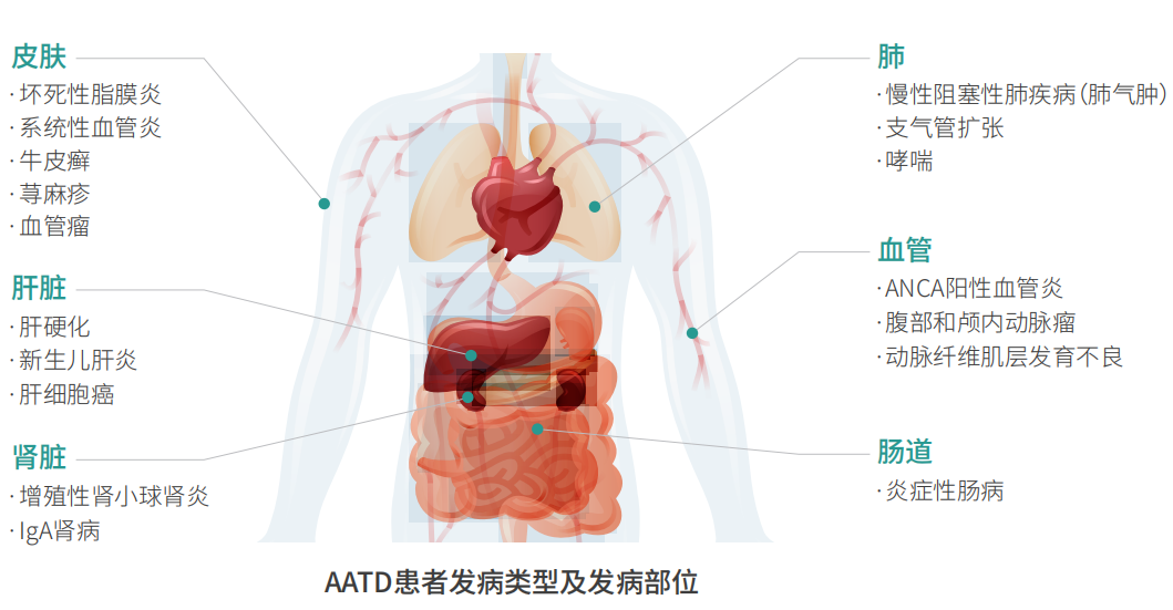 兒童發病(新生兒黃疸)約占10%,成人AATD發展為肝硬化的約占15%。基因突變導致α1-AT蛋白結構錯誤折疊與和分泌障礙(無法進入血液循環),α1-AT喪失正常生理功能,無功能的α1-AT間產生聚合反應,並在肝髒內積聚,不能拮抗內源和外源性蛋白酶對肝細胞的損傷,引發肝纖維化或肝硬化,嚴重者最終發展為肝衰竭(15%)。α1-抗胰蛋白酶缺乏症(AATD)還可能與其它一係列臨床疾病相關,如自身免疫性肝炎、膽結石、繼發性膜增生性腎小球腎炎、原發性硬化性膽管炎、脂膜炎、盆腔器官脫垂等。