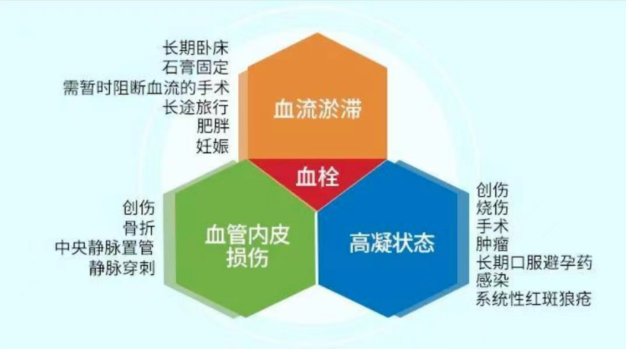 DVT 和 PTE 具有共同的危險因素,即 VTE的危險因素,包括任何可以導致靜脈血液淤滯、靜脈係統內皮損傷和血液高凝狀態的因素,即 Virchow 三要素。