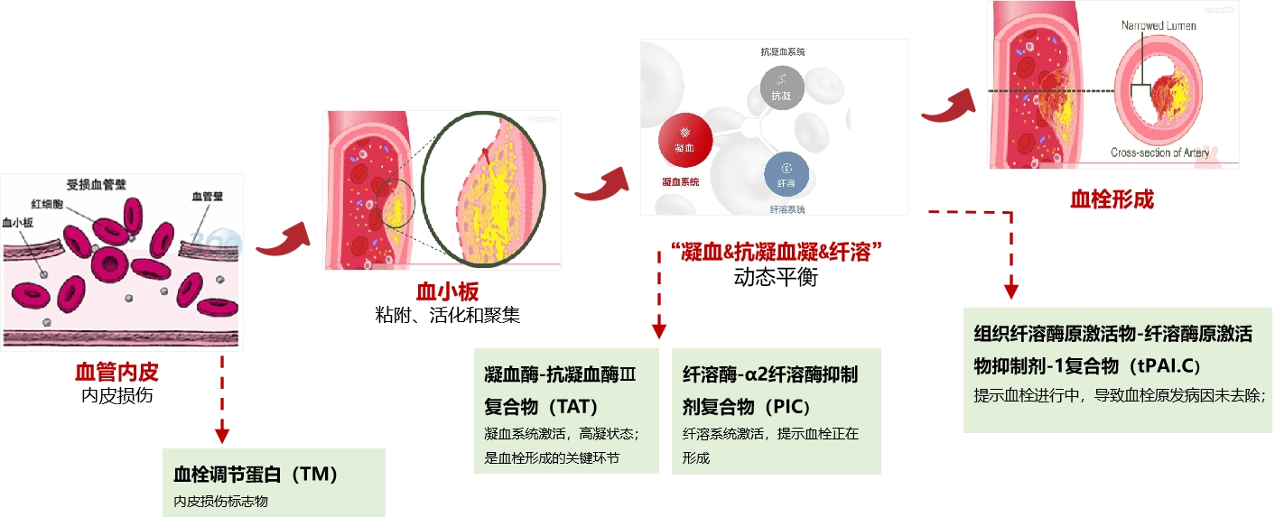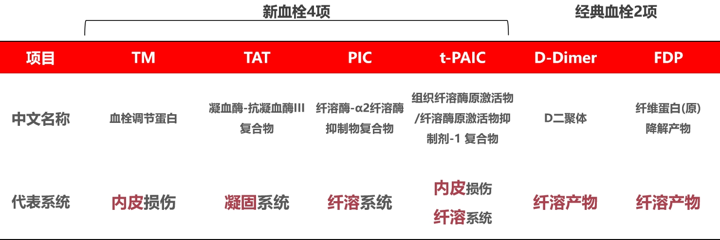 傳統的凝血四項(APTT、PT、TT、Fib)和纖溶二項(DD、FDP),都屬於在血栓形成後的被動檢測、晚期篩查項目,對血栓前狀態不敏感。新血栓四項(TAT、PIC、TM、t-PAIC)在血栓形成前即可檢出,能夠反映血栓早期病理進程。