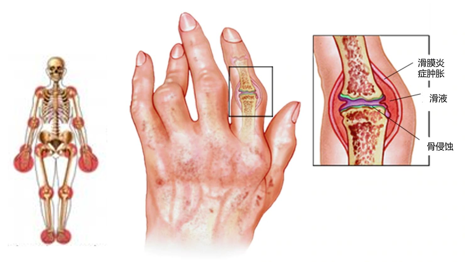 類風濕關節炎(RA:rheumatoid arthritis):是一種原因不明的侵蝕性、對稱性多關節炎為主要臨床表現的慢性、全身性自身免疫性疾病。基本病理表現為滑膜炎、血管翳形成,並逐漸出現關節軟骨和骨破壞,最終導致關節畸形和功能喪失。早期診斷、早期治療至關重要。