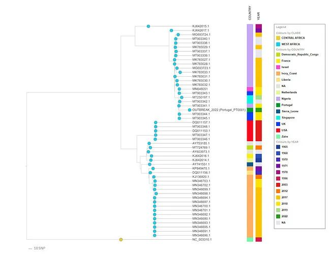根據上麵基因進化樹分析顯示,分離出來的病毒與2018年和2019年從尼日利亞傳播到英國、以色列和新加坡的病毒有密切關係。